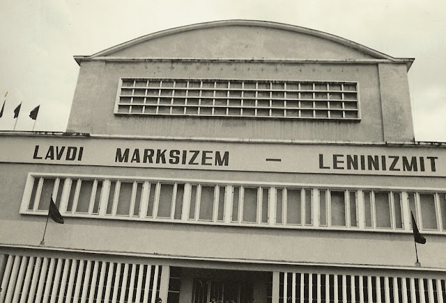 | Katolsk kyrka i nordalbanska Skhodër ombyggd till sporthall. Förutom de obligatoriska röda fanorna finns det på byggnaden texten "Leve marxismen-leninismen". Bilden tagen 1978 av Thomas Nydahl |