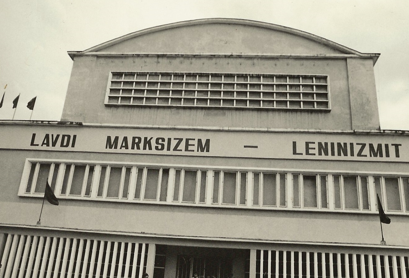 | Katolsk kyrka i nordalbanska Skhodër ombyggd till sporthall. Förutom de obligatoriska röda fanorna finns det på byggnaden texten "Leve marxismen-leninismen". Bilden tagen 1978 av Thomas Nydahl |